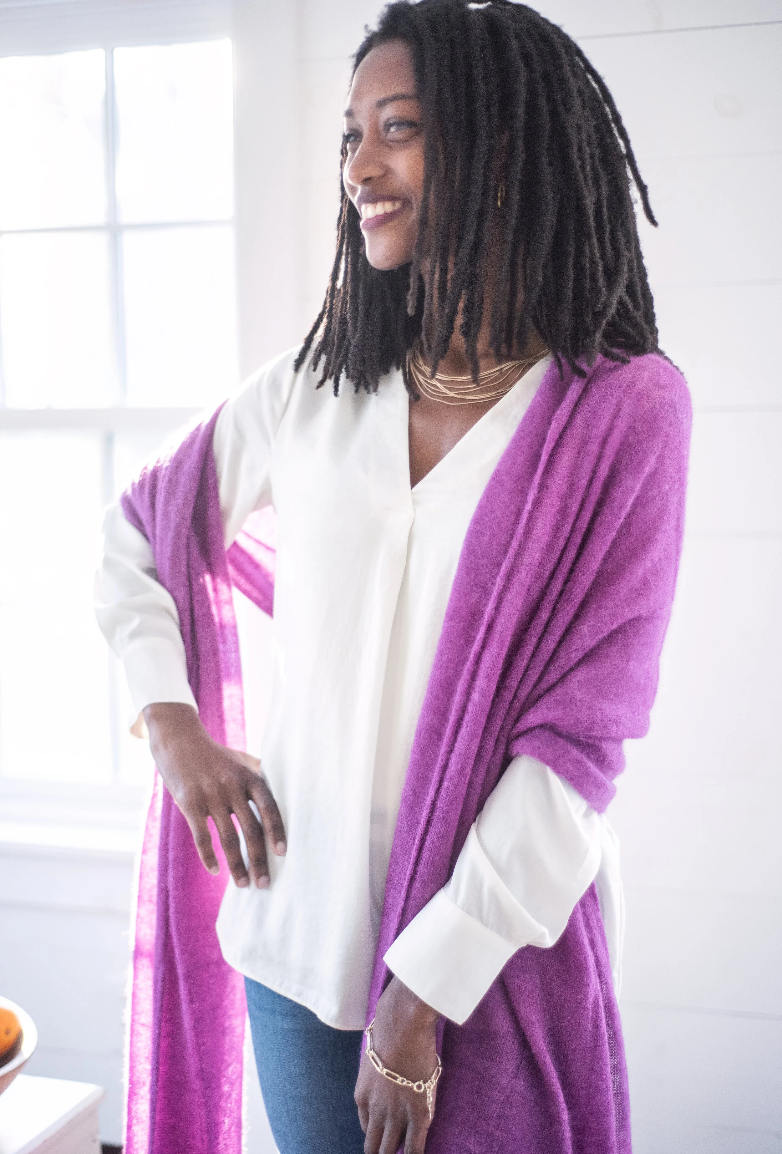 Our light-weight wraps are knit in a frothy blend of baby alpaca and silk and hand dyed in the mountains of Peru. Wear them with dresses or jeans - casual or formal. Either way it is a piece that always gets attention!
